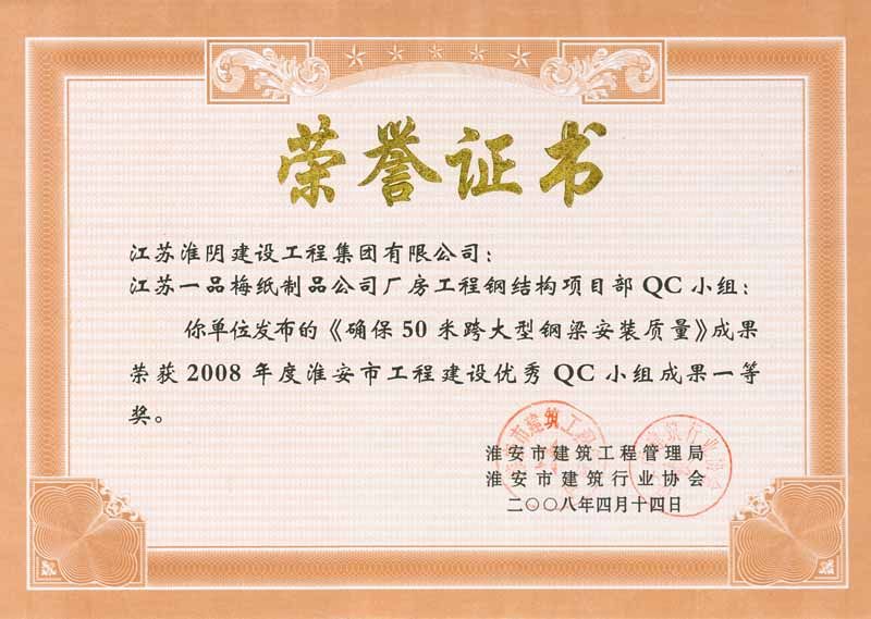 2008年市级QC一等奖(江苏一品梅纸制品公司厂房-确保50米