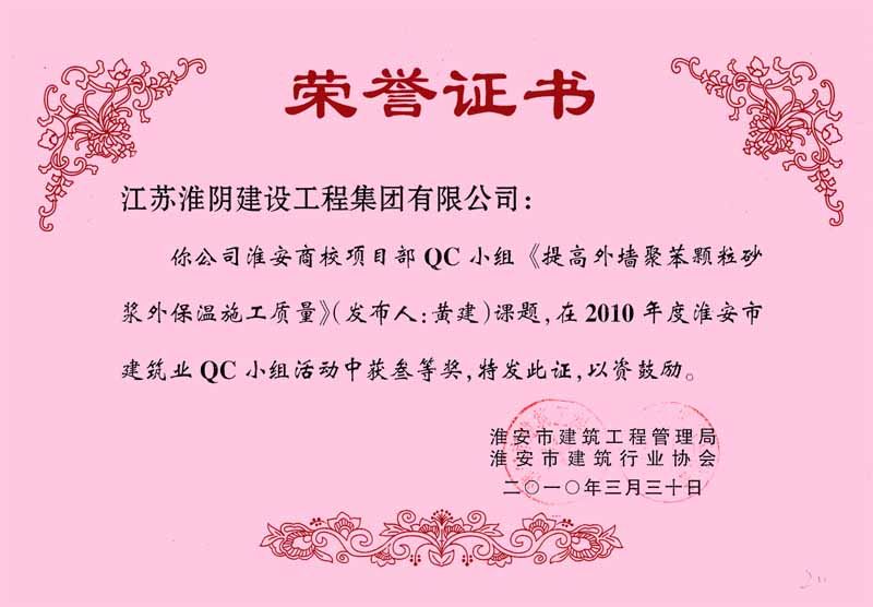 2010年市QC(三等奖)提高外墙聚苯颗粒砂浆外保温施工质量(淮安商校项目部-黄建)